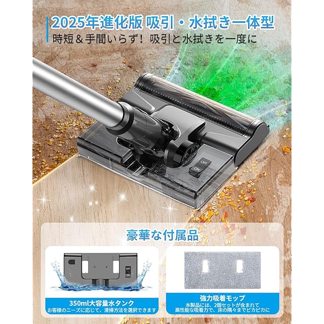 【独自の革新的水タンク設計で、掃除と水拭きを同時に実現】このコードレス 掃除機は、独自の革新的な水タンク設計を採用し、掃除と水拭きを同時に行うことで、清掃の効率を飛躍的に高めます。掃除と水拭きを同時に行うこの設計は、繰り返し清掃する手間を省くだけでなく、時間と労力を大幅に削減。掃除 の後にモップがけをする煩わしさから解放され、一度の操作で二つの作業を完了できるため、忙しい現代のライフスタイルにぴったりです。さらに、水拭き機能は均一な給水システムを搭載しており、床が過剰に濡れたり水跡が残ったりすることを防ぎ、床材を保護しながら徹底的な清掃を実現します。日常のお掃除から徹底的なクリーニングまで、これ一台で簡単にこなせます。