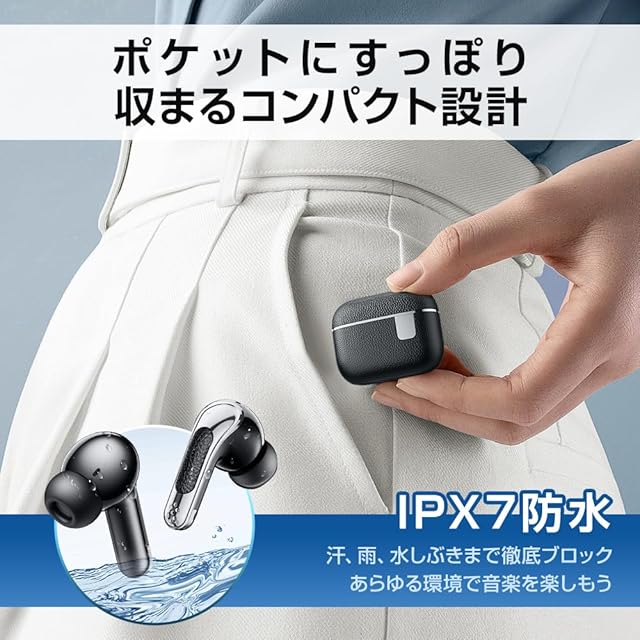 【IPX7防水&快適フィット設計】IPX7防水仕様で、汗や雨、水しぶきも徹底ブロック。ランニング、スポーツ、アウトドア、どんな環境でも気にせず使用可能な ワイヤレスイヤホン マイク付き 。日本人の耳に合わせた快適フィット設計で、長時間使用しても痛くなりにくい。ポケットにすっぽり収まるコンパクトデザインで、持ち運びにも便利な イヤホン です。