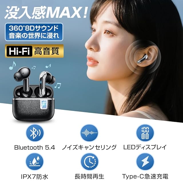 【超長時間再生&Type-C急速充電】 イヤホンワイヤレス 最大6時間のイヤホン単体使用、充電ケース併用で最大40時間、待機時間は驚異の60時間。通勤・通学・仕事・スポーツと一日中活躍するロングバッテリー。さらに、Type-C急速充電対応で、わずか1.5時間でフル充電が完了。バッテリー残量もLEDディスプレイで簡単に確認でき、いつでも安心して使用できる 完全ワイヤレスイヤホン です。