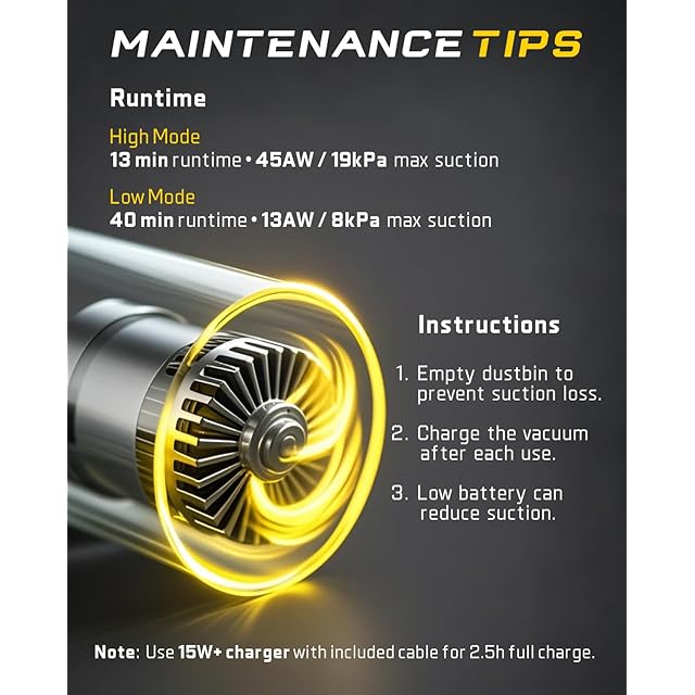 Type-C充電と急速充電: ユニバーサルなType-C充電ケーブルを使用して、コードレスハンディ掃除機を2.5時間以内に完全に充電できます。車内で充電するか、標準の充電器、コンピューター、モバイルバッテリー、またはさまざまな記憶デバイスで充電して、いつでもどこでも充電できます