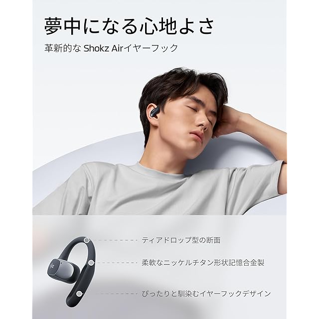 ぴったりと馴染むイヤーフックデザイン:超極細0.75mmの柔軟な形状記憶特性を持つニッケルチタン合金と、ソフトなシリコンで仕上げた「Airイヤーフック」が、あらゆる耳にフィットし、イヤホンをびったりと固定します。下 にくる部分を大きく上にくる部分を小さくデザインすることで、長時間のリスニングでも圧迫感を最小限に抑え、メガネをかけたままでも、お使いいただけます。