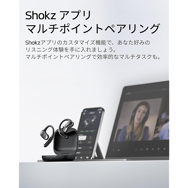 Shokz アプリ・マルチポイント対応:専用アプリで一括管理。オーディオの微調整、デュアルデバイスの接続、ボタンのカスタマイズ、ファームウェアのアップデートなどが可能です。より自由に使える10m範囲のBluetooth 5.2を搭載。ケースを開くだけでデバイスとペアリングし、片耳だけの使用時でも滑らかなパフォーマンスを楽しめます。シームレスにデバイスを切り替えられるので、デスクワークからワークアウト、リラックスタイムまで、タップひとつで切り替えられます。
