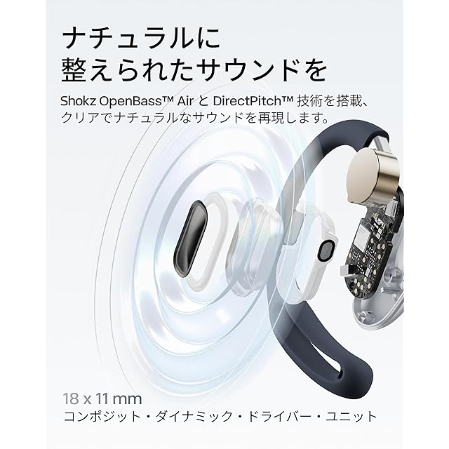 ナチュラルに整えられたサウンドを:当社独自のDirectPitch技術、Shokz OpenBass Air技術、18x11mmの大型ドライバーにより、オープンイヤー型でも高音質を実現し、ながら聴きに最適。単にバランスが取れているというだけでなく、音漏れを抑えてオーディオを正確にキープ。さらに、Shokzアプリの4つのプリセットEQモードでサウンドを自分好みに調整可能。