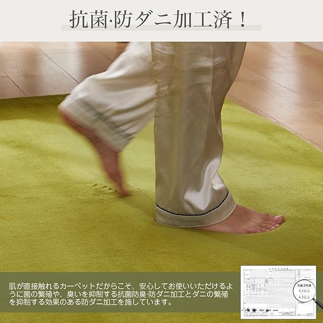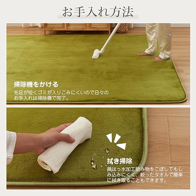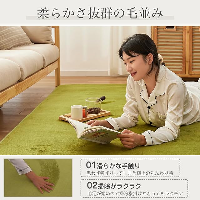 【短い毛足で簡単に掃除】カーペットの表面生地にはフランネル素材を使用し、繊細な毛先でやわらかく、滑らかな手触りを実現しました。短めの毛足でゴミが絡みにくく、一年中快適にお過ごしいただけます。