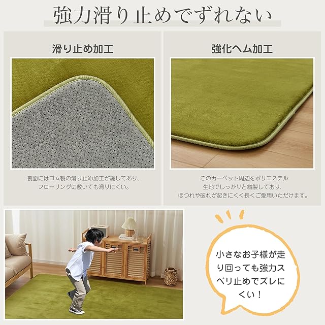 【滑り止め加工】裏面にはゴム製の滑り止め加工が施してあり、フローリングに敷いても滑りにくく、お子さまやお年寄りのいるご家庭でも安心です。ヘムの厚みを補強しているので、形が崩れにくいです。
