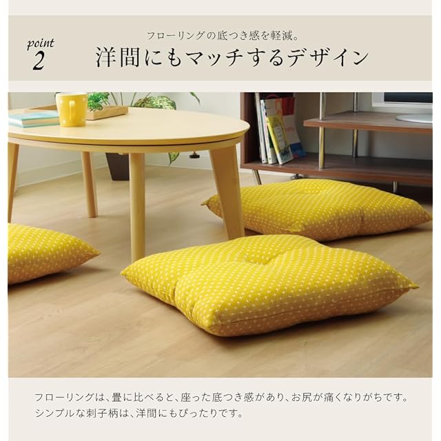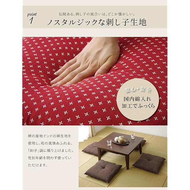 【おしゃれな刺し子】伝統のある刺し子の風合いに仕上げたふっくら座布団。和室だけでなくフローリングにも合う柄なので、場所を選びません。