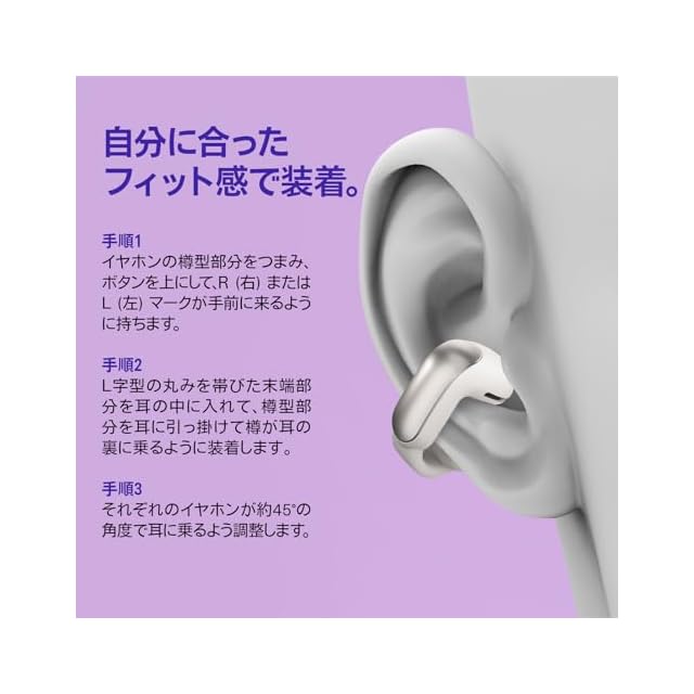 外の世界にも耳を澄ませる: 豊かな空間オーディオを楽しみながら、周囲とのつながりも保つリスニング体験。オープンイヤーの開放型デザインのワイヤレスイヤホンは、「周りとのつながりも大切にしている」というメッセージを発信する一方で、OpenAudioテクノロジーが高品質のプライベートサウンドを実現します。