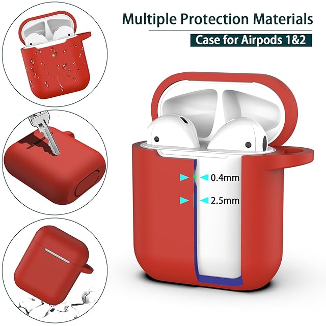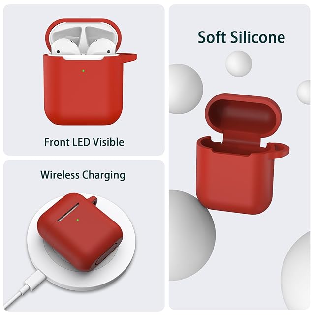 R-fun AirPodsケースカバー対応、キーチェーン付きソフトシリコン保護カバー、女性と男性用、Apple AirPods第2世代第1世代充電ケース対応、フロントLEDライト付き、レッド
