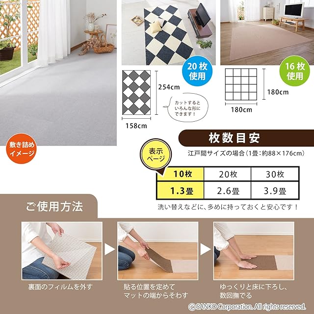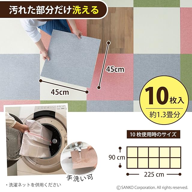 サイズ : 10枚組 【2㎡、1.3畳分】 45×45cm(厚み4mm)、重量:115g(1枚)