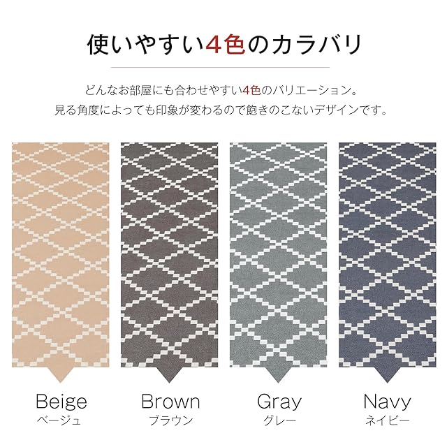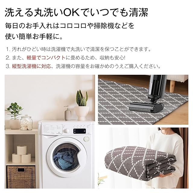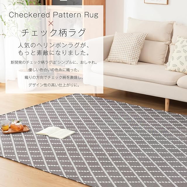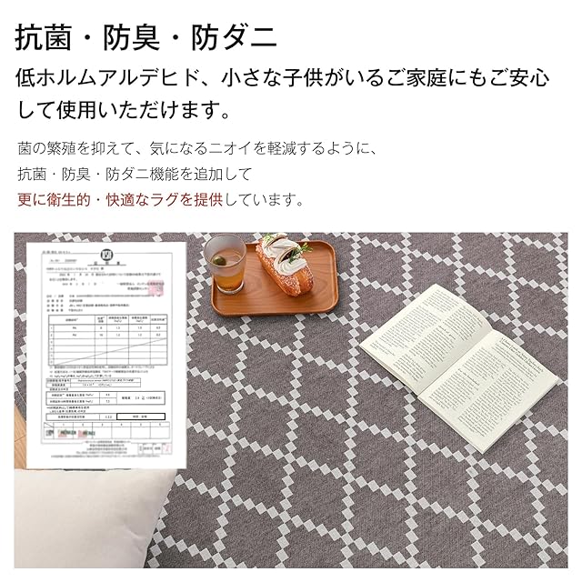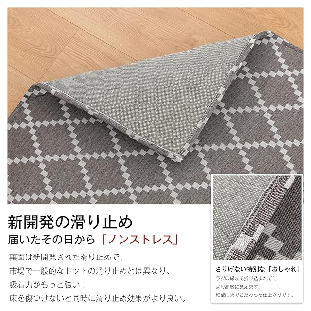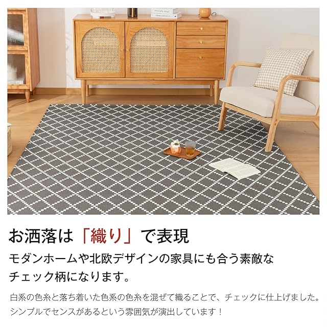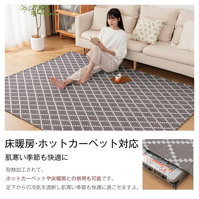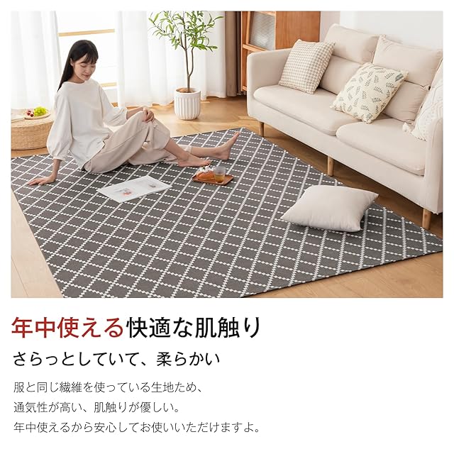 『肌触りとスタイリッシュさを両立』服と同じ繊維を使っている生地ため、通気性が高くて肌触り優しい、暑い日でも蒸れない、肌寒い季節もホットカーペットや床暖房との併用も可能、年中に使えるラグです。