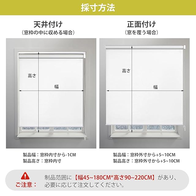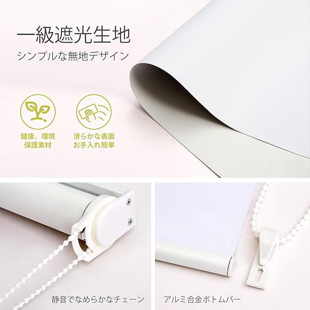 【取り付け簡単】 ロールスクリーンの取り付けは比較的簡単です。取扱説明書が付きです。正面付け、天丼付け カーテンレールにも簡単に取付できます。大抵の場合、特別な工具は必要ありません。ドライバー1本を使えて、2ステップで誰でも簡単に取り付けられます。素材は100%ポリエステル ヘッドレール:アルミニウム チェーン: PVC
