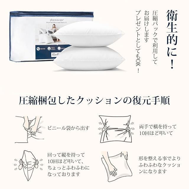 【圧縮梱包でお届け】 本製品は圧縮梱包されお届けします、圧縮加工で真空になるので、ゴミなどが入らない、衛生的です。(クッションの復元方法:商品を開封し袋から取り出して、中央に向かって全体的に空気を入れるように揉んでください。そして、手で触りながら、綿のかたまりを探し、全体をまんべんなくもみほぐしてください。)サイズ:55×55cm 2個セット 側生地:綿100% 充填物:中空シリコン化マイクロファイバー (カバーよりワンサイズ大きめのサイズがおすすめです!もっと厚みがでる!)