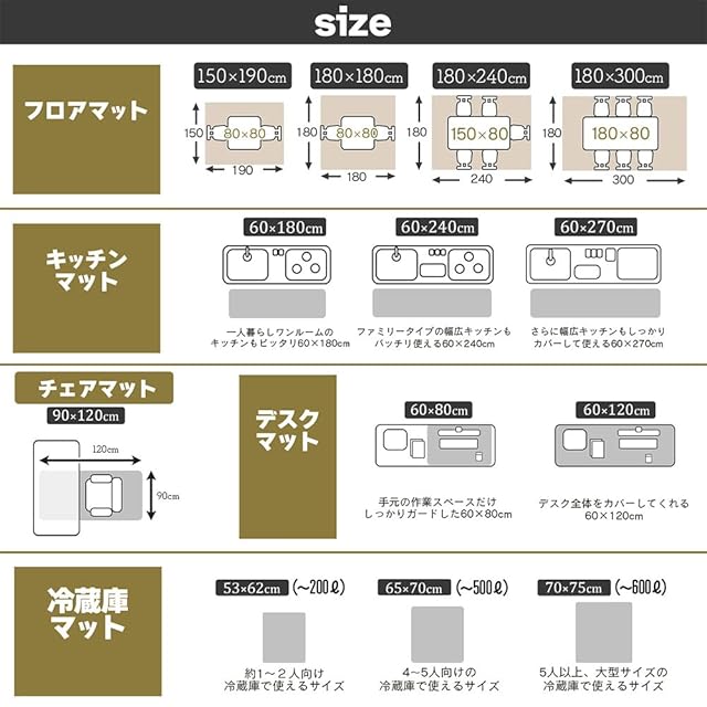 【ご注意ください】丸めて梱包しておりますので、開封直後は波のような形がついている場合がございます。数日間広げておきますと徐々にシワが伸びてまいります。気温によって伸び具合は異なりますが安心してご使用ください。 ■記載サイズは規定値です。伸縮性のある素材なので若干の誤差が生じる場合がございます。予めご了承ください。 ■開封直後は匂いが強い場合がございます。ご使用とともに匂いは取れてまいります。風通しの良い場所で陰干しを行うと匂いが緩和されます。 ■マットと接地面の間に水分が入ってしまった場合は放置せず、拭き取ってください。抗菌・抗カビは製品に対してです。水分を放置されますと接地面にカビが発生する可能性もございます。 ■日の当たる場所でご使用しないでください。日焼けで硬化する場合もございます。 ■光沢感等はご覧いただいているモニターや、機器等によって色味に若干の誤差が生じる場合がございますのでご了承ください。 ■80℃の耐熱温度を超える物をマットの上に置くと、変形や変色の恐れがございます。
