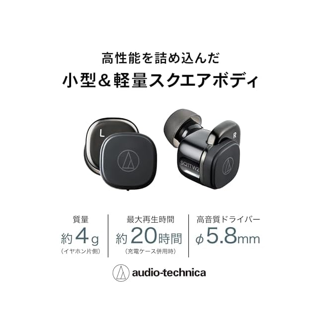 オーディオテクニカ ATH-SQ1TW2 BK ワイヤレスイヤホン bluetooth/小型 軽量 / 最大20時間再生 / 低遅延/外音取込み/マルチポイント/マルチペアリング/防水 IPX5 / ワイヤレス充電 /【国内正規品】ブラック ATH-SQ1TW2 BK