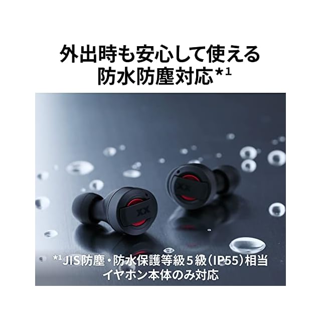 【アクティブなシーンでも安心して使える】衝撃からイヤホンを守るラバープロテクターに加え、IP55相当の防水※1・防塵※1を実現した「TRIPLE PROOF」タフボディを採用。汗や水、砂埃に強くアウトドアやストリートなどのアクティブなシーンでも安心して使えます。※1:JIS防塵・防水保護等級5級(IP55)相当。イヤホン本体のみ対応。