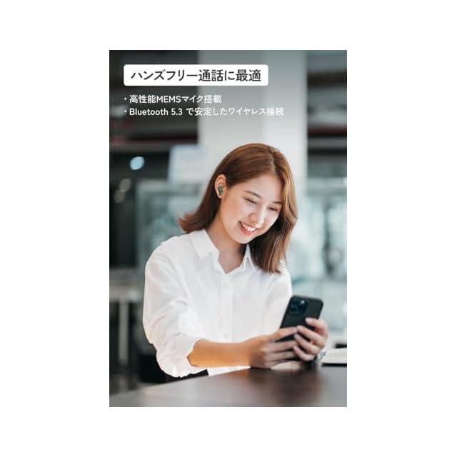 【クリアで高品位な通話性能】 イヤホン本体の左右それぞれに、 高性能MEMSマイクを搭載、クリアで高品位な通話性能を実現しました。また、通話中に本体ワンタッチで、マイクのON/OFFの切り替えることができます(マイクミュート機能)。