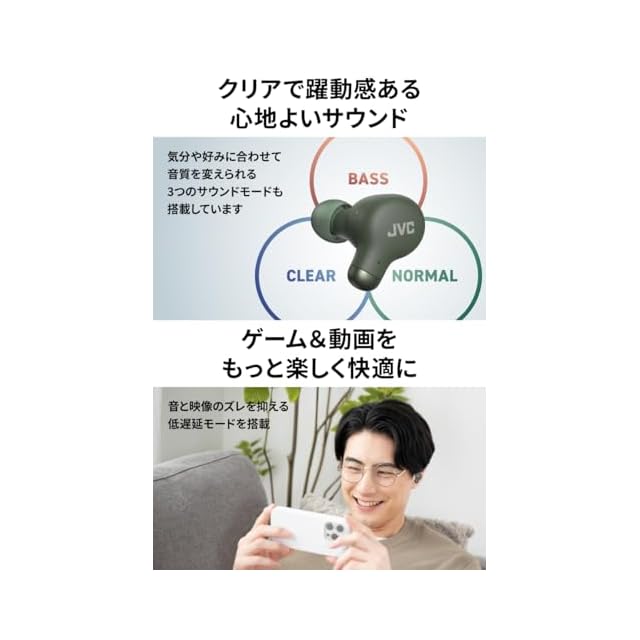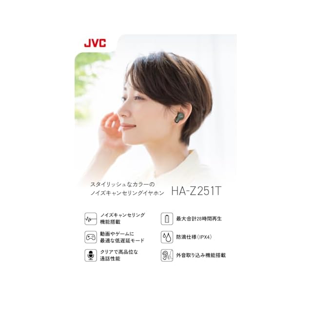 JVCケンウッド JVC HA-Z251T-G ワイヤレスイヤホン Bluetooth Ver5.3 ノイズキャンセリング 外音取込み機能 マイク付き 最大28時間再生 小型 軽量 防滴 IPX4 低遅延モード テレワーク グリーン
