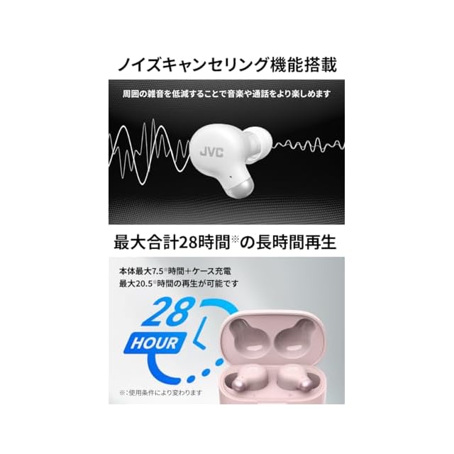 【合計28時間※の長時間再生】 イヤホン本体約7.5時間※+ケース充電約20.5時間※の再生が可能です。また、左右どちらでも片耳使用に対応。片耳を交互に使用することでより、より長時間の使用が可能です。※使用条件により変わります。
