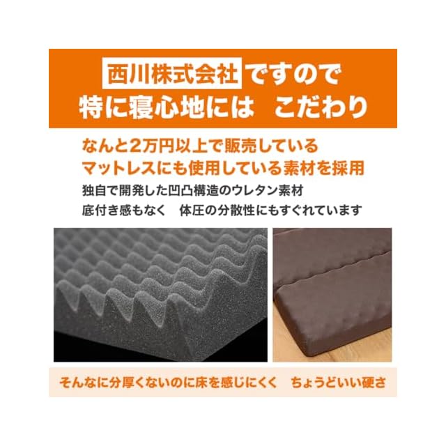 取り扱い上の注意 ソフトな素材で出来ていますので、立ち歩きする場合は十分注意してください。 製造工程及び原材料の特性上、開封当初はウレタンフォーム特有の臭いがする場合があります。気になるときは風通しのよいところにしばらく置いていただき、臭いを発散させてください。 ウレタンフォームの特性上、ウレタンフォームが黄変する場合がありますが、品質に問題はありません。 素材の特性上、ご使用開始直後は少し硬く感じる場合がございます。 ウレタンフォームは強く引張ったり、外装生地(側)との摩擦などでひび割れや一部欠損などが起こる場合があります。外装生地から中材を出し入れする際などは取り扱いにご注意ください。ひび割れや一部破損があった場合でもご使用上問題はありません。 ご使用していると外装生地(側)がずれる事がありますが、ご使用上は差し支えありません。 長時間敷き続けますと裏側に湿気がこもり、マットレス及び畳、床などにカビが生える事があります。直射日光を避け、風通しの良い室内等で陰干ししてください。 外装生地(側)の汚れを防ぐために、シーツや薄手のパッドをお使いください。