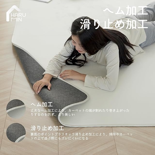 【滑り止めでズレにくく、まるで床に貼りついているかのようなカーペット】丈夫なエッジ加工と底部の点プラスチック加工により、上で走ったり飛び跳ねたり、また掃除機をかけても移動しにくくなっており、子供やペット、お年寄りのいるご家庭におすすめです。