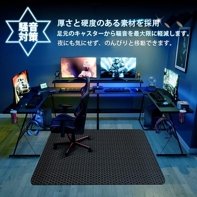 【ベスト厚さ1.5mm・騒音対策】1.5mmの厚さで、キャスターが引っかからなく、沈み込まないよう、方向転換も自由自在に移動できます。段差が気にならない、ロボット掃除機も引っかかることなく、ストレスフリーでお掃除が楽々。大きなキャスターの回転音を軽減することもできます。集合住宅ではマストアイテムです。夜中にゲーミングと作業するときは、騒音を心配することがなく、やり続けます。ヒント:裏面はツルツルのデザインで、しっかりと床面に吸着されますが、畳/カーペットの上には吸着不可です。ご了承くださいますようお願い申し上げます。