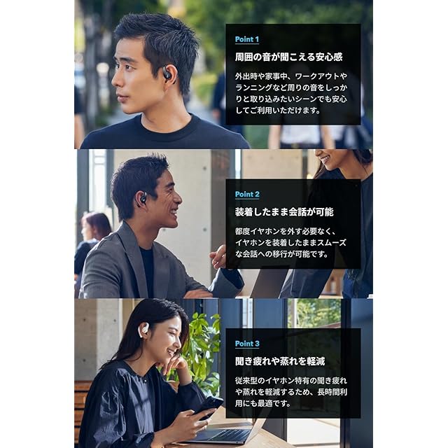 耳を塞がないというイヤホン体験の新常識:周囲の音が常に聞こえるため、家事やランニング、会話をしながらでも安心して利用可能です。またイヤホン特有の聞き疲れや蒸れを軽減することで快適な装着感を提供します。