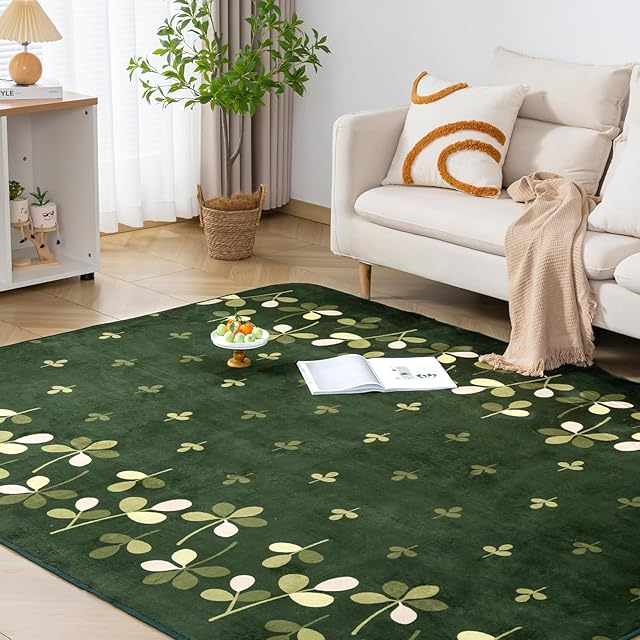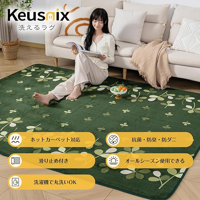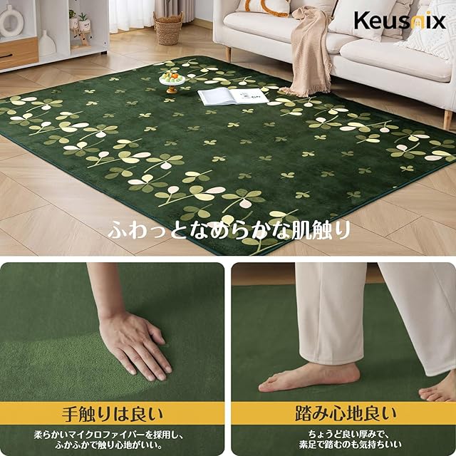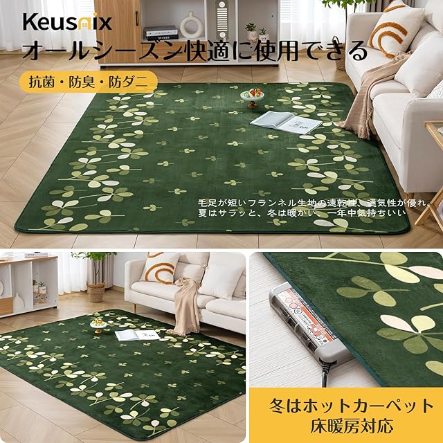 Keusnix カーペット ラグ ラグマット滑り止め付 洗える 200×250cm 約3畳 絨毯 防ダニ 抗菌 防臭 オールシーズン快適に使用 床暖房 ホットカーペット対応 ふわふわ肌触り フランネルラグ リーフ・グリーン