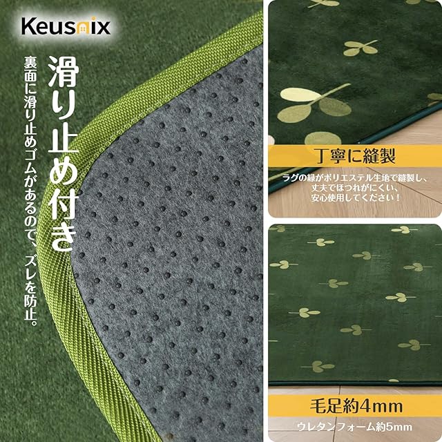 【商品仕様】カラー:グリーン ラグサイズ 3畳 200×250cm 。起毛の高さ:約4mm、ウレタン厚:約5mm、不織布と滑り止め加工は約1mm、合計厚さ約10mmです。 絨毯表地:ポリエステル100% 中材:ウレタンフォーム 裏地:ポリエステル100%(不織布)