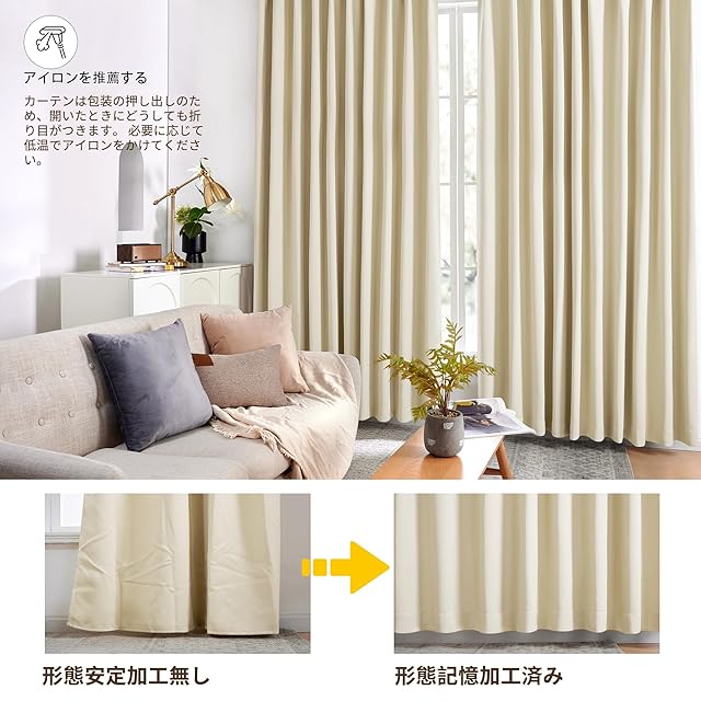 【形態記憶と美しいライン】形態記憶加工により吊るした瞬間から美しいドレープが整い、お部屋をすっきり演出します。窓幅に対して1.5倍程度のカーテン幅で吊るすとより高級感のある見た目になります。