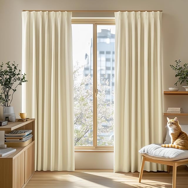 【遮光性能と等級】厚手ポリエステル生地で光をしっかりカットし、淡色カーテンは2級遮光(遮光率99.91%)でやさしい採光を保ちながら、昼間のまぶしさや夜間の視線を効果的に和らげます。