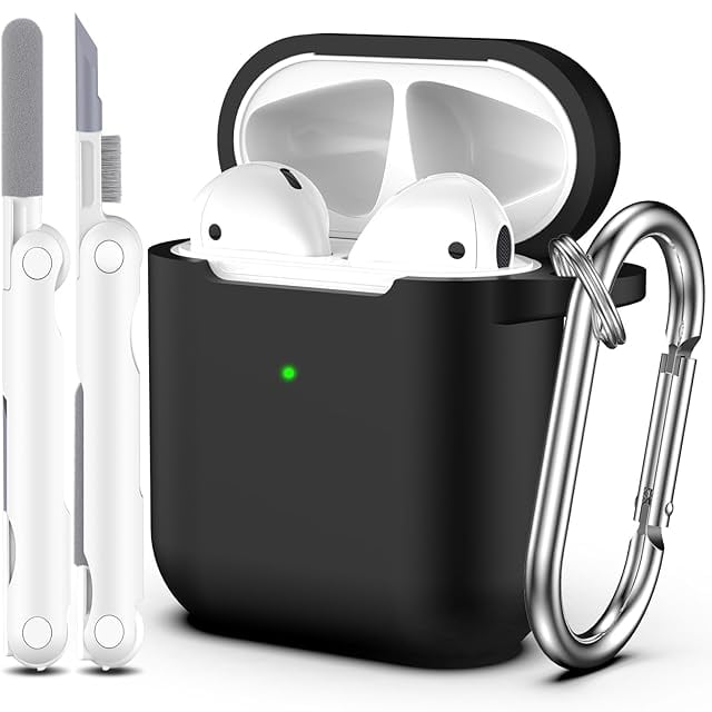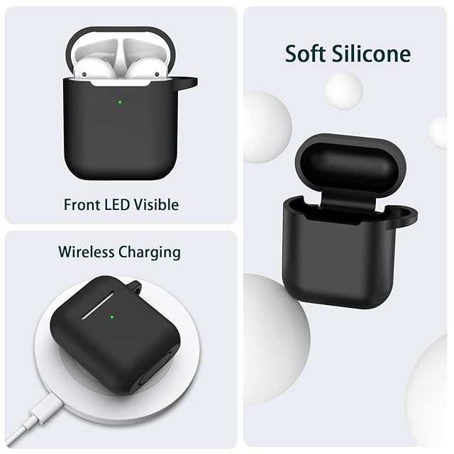 R-fun AirPodsケースカバー対応、キーチェーン付きソフトシリコン保護カバー、女性と男性用、Apple AirPods第2世代第1世代充電ケース対応、フロントLEDライト付き、ブラック