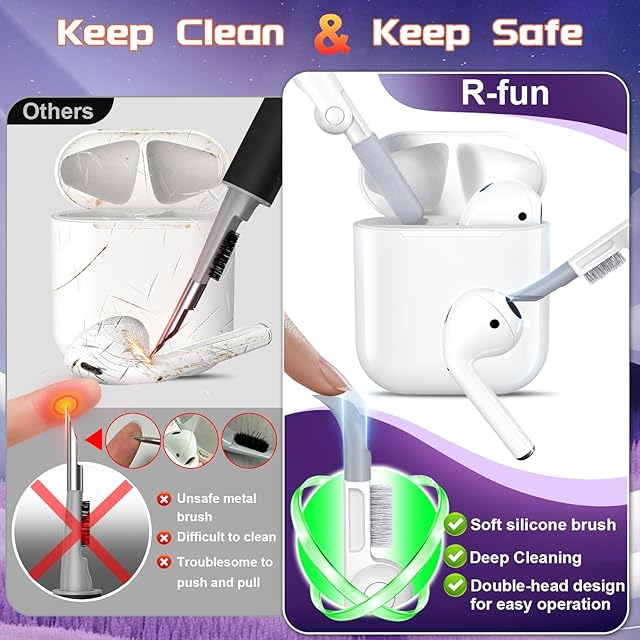 【多機能クリーニングペン】: クリーナーキットにはシリコン製のペン先が付いており、隠れた亀裂や穴の汚れを取り除けます。柔らかいフロックスポンジがワイヤレスイヤホンの充電ケース内の細かいほこりを吸収します。高密度ブラシでイヤホンのサウンドホールの汚れを簡単に掃除できます。