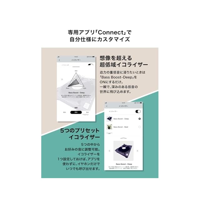 想像を超える、超低域イコライザー:迫力の重低音に浸りたいときは、専用プリセットイコライザー「Bass Boost - Deep」をON にするだけ。通常のイコライザー調整範囲よりさらに低い音域の「超低域」を拡張することができます。小さなイヤホンからは想像できない、深みのある低音の世界に飛び込めます。