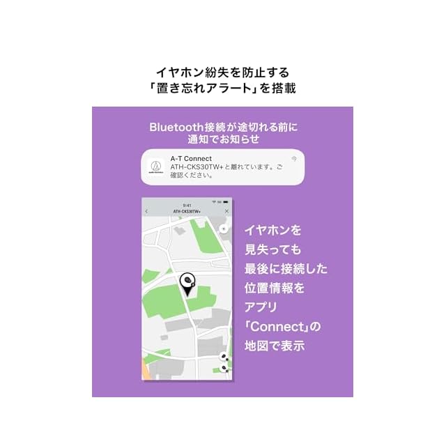 置き忘れアラートとIP55相当の防水・防じん性能:Bluetooth接続の電波が弱くなっていることを知らせる「置き忘れアラート」を ONにすると、接続が途切れる前にイヤホンから離れていることに気付くことができます。JIS 保護等級:IP55 相当(イヤホンのみ)*。日常のさまざまなシーンでイヤホンが使える高い防水性能と、砂ぼこりなどの環境下でも使える防じん性能を採用。
