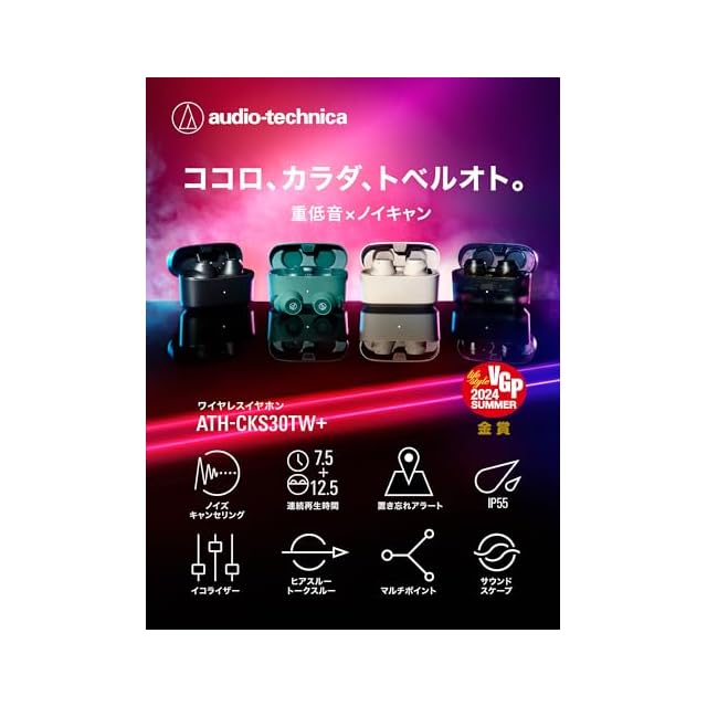 オーディオテクニカ ATH-CKS30TW+(E) ワイヤレスイヤホン bluetooth ノイズキャンセリング 重低音 最大約20時間再生 IP55 防水防塵 マルチポイント対応 小型軽量 アプリ対応 ヒアスルー 低遅延モード 置き忘れアラート BK ブラック