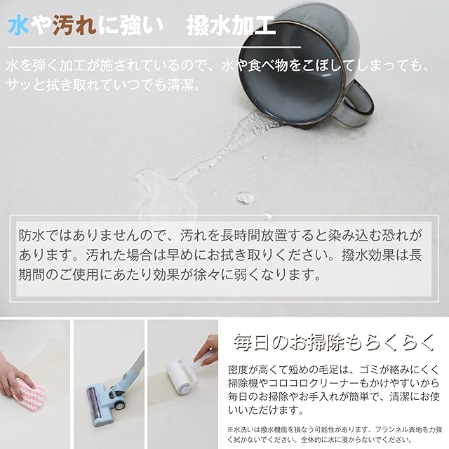 【撥水加工・簡単に掃除】うっかり飲み物をこぼしてしまっても、表面で水玉模様になるので、すぐに拭き取れば大丈夫です。毛足が短いから、ゴミやほこりが絡まりにくい、掃除機もスイスイかけられ 、毎日の掃除が楽になる。いつでも清潔、快適にお使いいただけます。忙しい社会人・ママたちも満足な快適仕様。