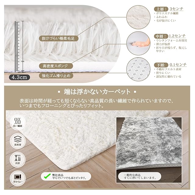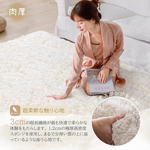 Beddiny カーペット ラグ ラグマット 洗えるラグ【中層:極厚30D高密度ウレタン 独自技術の抗菌防臭加工】絨毯 オールシーズン快適に使用 滑り止め付き 高密度シャギーラグ アイボリー 200×300cm