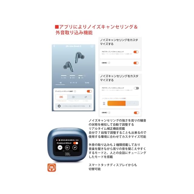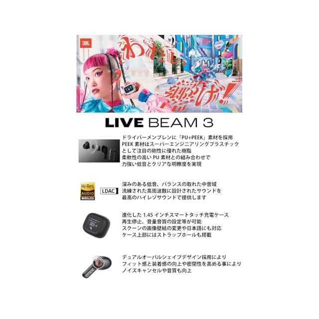 JBL LIVE BEAM 3 ワイヤレスイヤホン スマート充電ケース/LDAC対応ハイレゾ/マルチポイント/ハイブリッド ノイズキャンセリング/IP55防水/ワイヤレス充電対応/ブルー/JBLLIVEBEAM3BLU