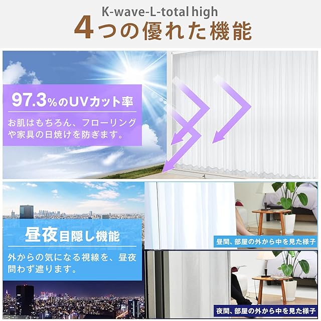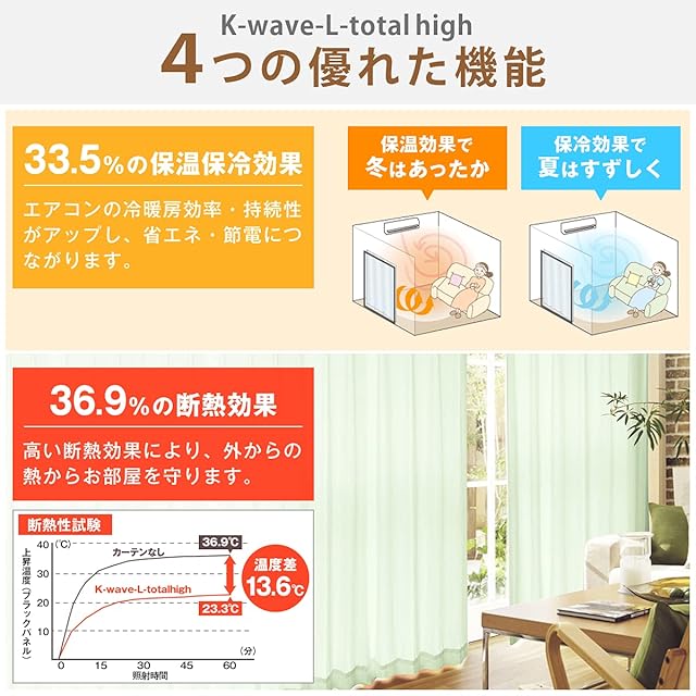 紫外線約97.3%カット・断熱効果36.9%・保温効果33.5%!お部屋にいるあなたの大切なお肌や家具・カーペットなどの日焼けを防いでくれる「K-wave-L-total high」カーテンです。