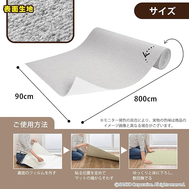 サンコー 廊下敷き マット カーペット はっ水 消臭 日本製 おくだけ吸着 ロングマット 90×800cm ライトグレー KP-52