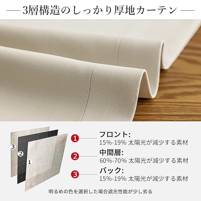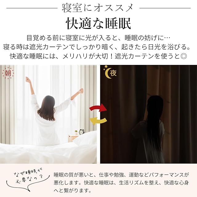 【プライバシーを守る】室内の光を外に漏れにくくする効果があるだけではなく、夜に部屋の明かりを付けている時でも外から人影が見えづらく、プライバシーを守ることができます。女性の一人暮らしでもこのカーテンなら安 心できる