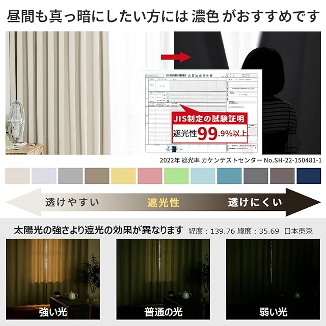 【99.9%以上遮光】迷ったらこれ!シンプル&機能性重視の方におすすめです。この1枚(99.9%以上遮光ドレープカーテン1枚)を選択する理由:①光沢を抑えたマットな質感が美しい。②黒ずみの少ないなめらかな生地。③快適に過ごせる優れた性能。遮光率99.9%以上、日差しの強い窓でもしっかりと遮光できるので、光をできる限りシャットアウトしたい方におすすめです。