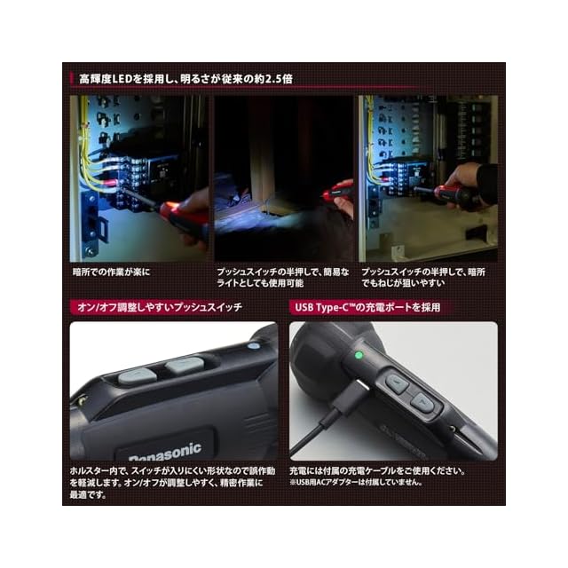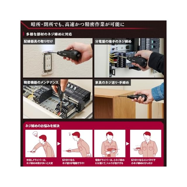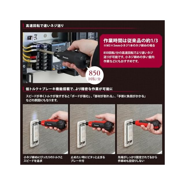【特徴】高速&精密仕上げが特徴の充電ミニドライバーです。従来品と比べて回転数が850回転/分の約3.5倍の高速回転を実現しました。暗所・閉所でも、高速かつ精密作業が可能になっています。配線機器の取り付けや分電盤の端子のネジ締め、精密機器のメンテナンス、家具のネジ送り・手締め(下穴、ねじ切りがある場合)など多彩な部位のネジ締めに対応しています。高速回転で速いネジ送りが実現され、作業時間は従来品の約1/3(M3×5mm小ネジ1本のネジ締めの場合)に短縮されています。さらに低トルク+ブレーキ機能搭載で、より精密な作業が可能になりました。高輝度LEDライトを採用し、従来品の約2.5倍の明るさで作業の効率化をはかります。オン/オフが調整しやすいプッシュスイッチの半押しでLEDライトのみ点灯させることが出来るので、簡易的なライトとしても使用可能です。その他、充電量が適正レベルになると充電を自動停止する機能や負荷がかかり過ぎると自動停止しモーターと電池を保護する便利な機能を搭載しています。