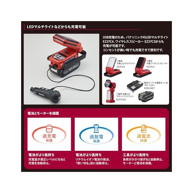 【仕様】本体サイズ:全長131×全高42×全幅42㎜/重量:170g/基本性能:正転・逆転、手締め機能、ブレーキ付、LEDライト/電池(内蔵式):リチウムイオン電池3.7V、850mAh/充電時間:約55分(当社EZ37C4・EZ37C5・EZ37C6の場合)、約60分(市販USB充電器5V 1Aの場合)、約45分(市販USB充電器5V 2Aの場合)/チャック:ワンタッチビットロック方式(段付までの寸法が9㎜・11.5㎜・13㎜)/適合ビット:六角ビット 対辺6.35㎜/締付トルク:<電動時>0.4N・m(剛性体最大締付トルク)、<手締め時>8.0N・m(最大耐久トルク)/回転数(毎分):850回転/付属品:ミニドライバー用ビットセット(黒染加工)、USB充電ケーブル(長さ50cm、USBType-A to USBType-C ※充電には市販品のUSB用ACアダプタが必要です)/カラー:レッド