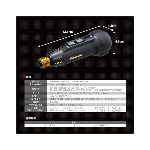 【仕様】本体サイズ:全長131×全高42×全幅42㎜/重量:170g/基本性能:正転・逆転、手締め機能、ブレーキ付、LEDライト/電池(内蔵式):リチウムイオン電池3.7V、850mAh/充電時間:約55分(当社EZ37C4・EZ37C5・EZ37C6の場合)、約60分(市販USB充電器5V 1Aの場合)、約45分(市販USB充電器5V 2Aの場合)/チャック:ワンタッチビットロック方式(段付までの寸法が9㎜・11.5㎜・13㎜)/適合ビット:六角ビット 対辺6.35㎜/締付トルク:<電動時>0.4N・m(剛性体最大締付トルク)、<手締め時>8.0N・m(最大耐久トルク)/回転数(毎分):850回転/付属品:ミニドライバー用ビットセット(黒染加工)、USB充電ケーブル(長さ50cm、USBType-A to USBType-C ※充電には市販品のUSB用ACアダプタが必要です)/カラー:ブラック&ゴールド
