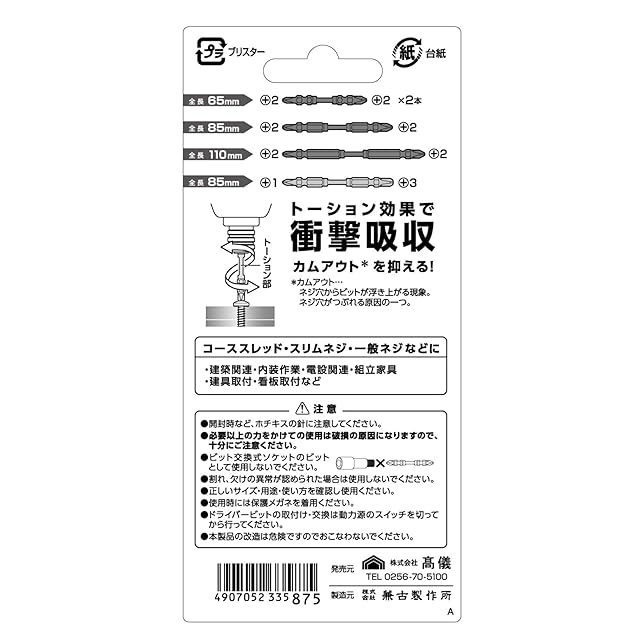 65mm両頭ビット:+No.2×2本、85mm両頭ビット:+No.2×1本、110mm両頭ビット:+No.2×1本、85mm両頭ドライバービット:+No.1×+No.3×1本