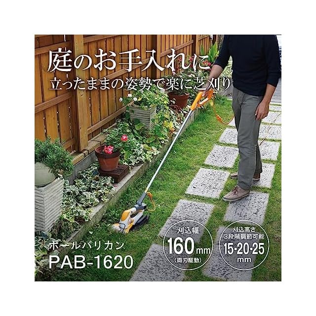 京セラ(Kyocera) 旧リョービ ポールバリカン PAB-1620 刈込幅160mm キワ刈りガイド付 693952A 【屈まずに芝刈りができる便利な1台】 キワ刈りガイドで壁や刃を傷つけないでキワの芝をカット 日本製ブレード採用 刈込幅160mm 両刃駆動 刈込高さ調整3段階 ポール角度可変