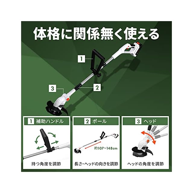 ◆楽な姿勢で使える3カ所で調整可能。 1.補助ハンドル:持つ角度を調節 2.ポール長さ、ヘッドの向きを調節 3.ヘッド:ヘッドの角度を調節さらに、肩掛けベルトで重みを分散でき楽々刈れる。