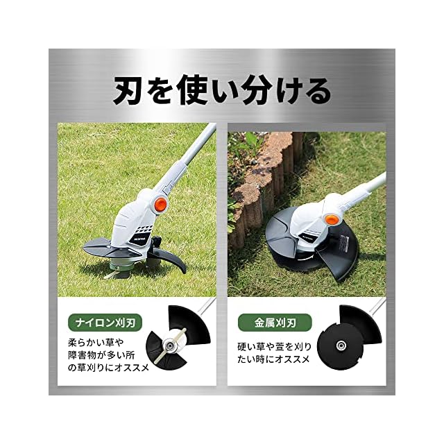 ◆使い分けできる2種のカッター付きナイロン刈刃×5個、金属刈刃(8枚刃)。◆草が絡みにくい絡まり保護パーツがあるため草が絡みにくい。ノンストレスで作業できる。
