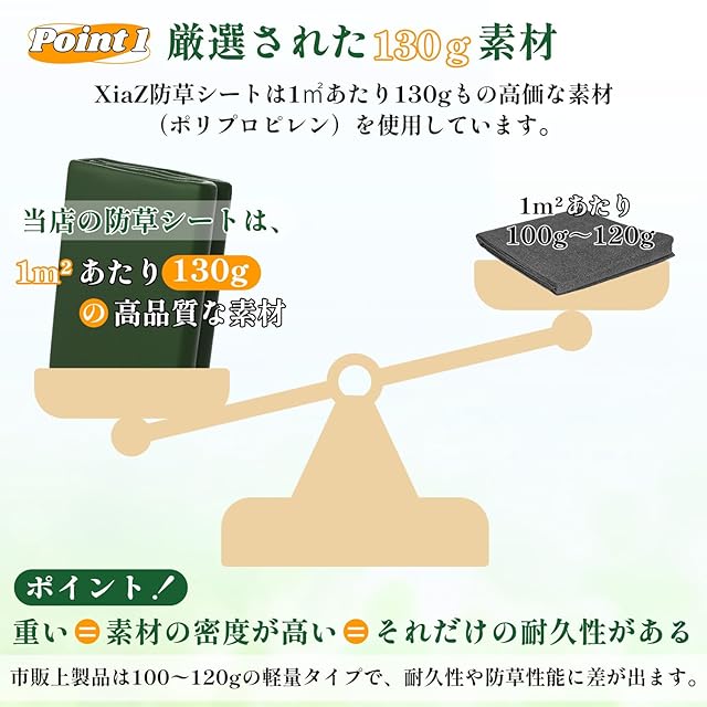 【厚さ130g/㎡で長持ち!】弊社の不織布防草シートは、一般的な防草シートが100g/m²程度のところ、当社製品は約1.3倍の厚みを持つ130g/m²を実現。物理的な強度が高く、太陽光を強力に遮断。雑草が光合成を行うのを徹底的に阻止し、根元からの成長を抑制します。さらに、紫外線や外部からの摩擦にも強く、一般的な防草シートと比較して格段に長持ち。一度敷けば数年間にわたり雑草の発生を徹底的にブロックし、面倒な「草むしり地獄」からあなたを解放します。